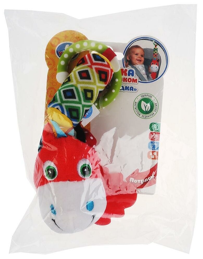 Type: hanging toy, effects: sound, educational elements: bell, squeaker, teether, tactile inserts, rustling and crunchy elements, material: plastic, textile