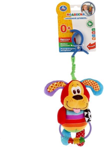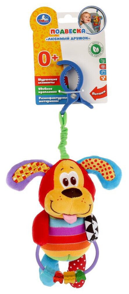 Type: hanging toy, effects: sound, educational elements: rattle, tactile inserts, material: plastic, textile