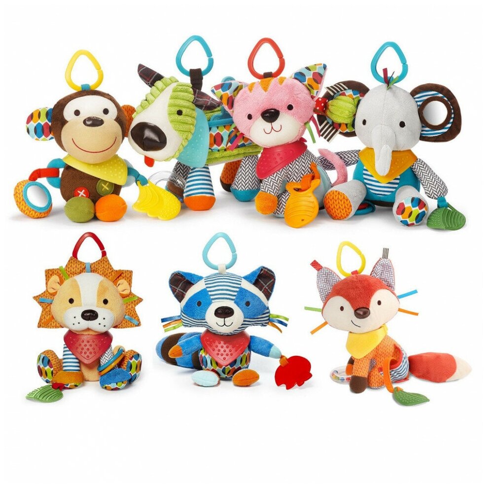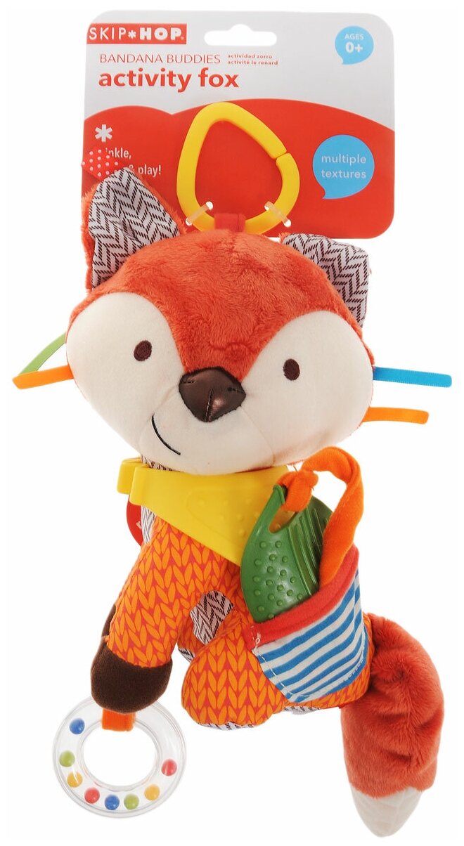 Type: hanging toy, effects: sound, educational elements: bell, rattle, teether, tactile inserts, material: plastic, rubber, textile