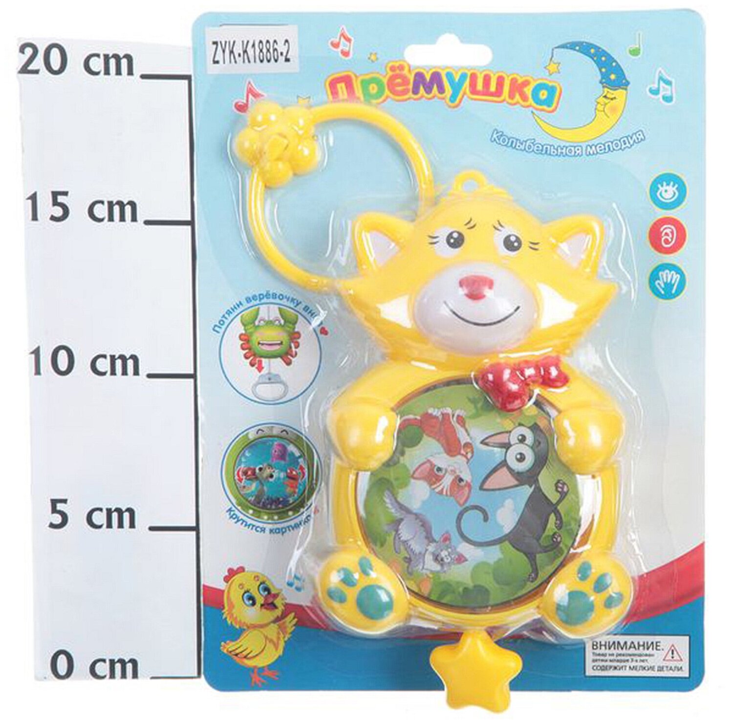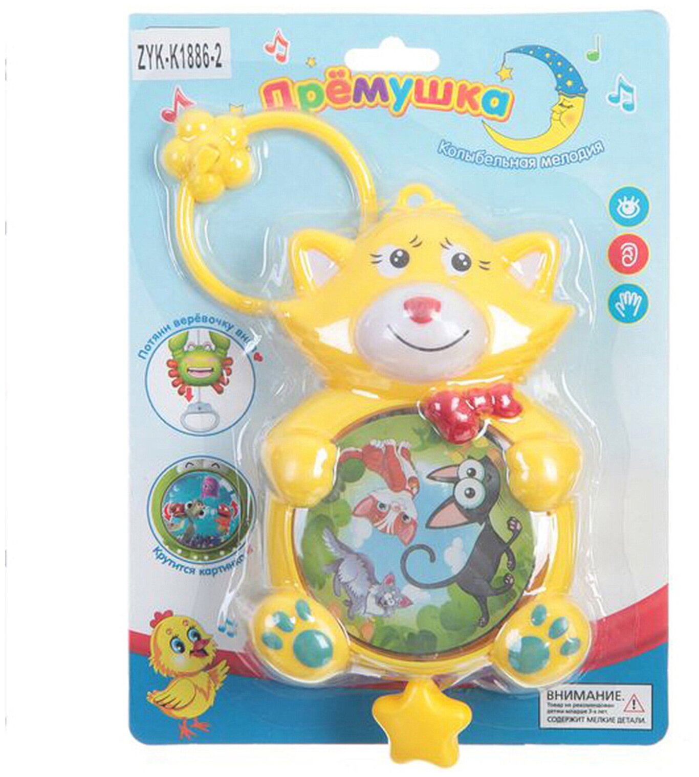 Plays a lullaby melody, for this you need to pull the rope attached to the bottom of the toy, along with the beginning of the melody, the picture with the image of cats will start spinning