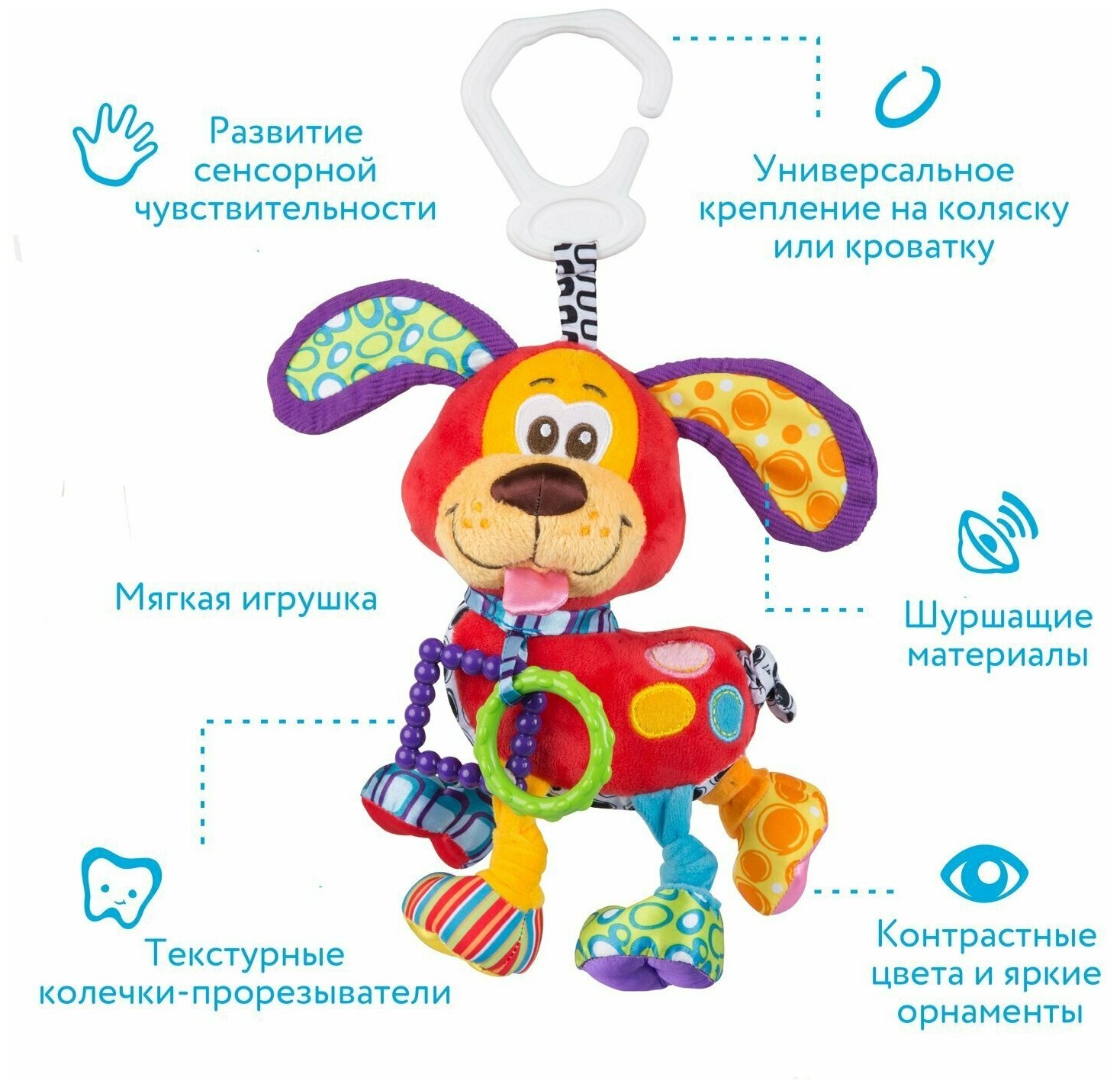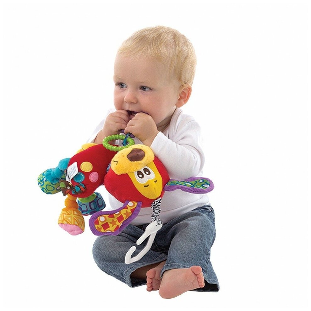 Type: hanging toy, effects: vibration, sound, educational elements: rattle, teether, tactile inserts, rustling and crunchy elements, material: plastic, textile