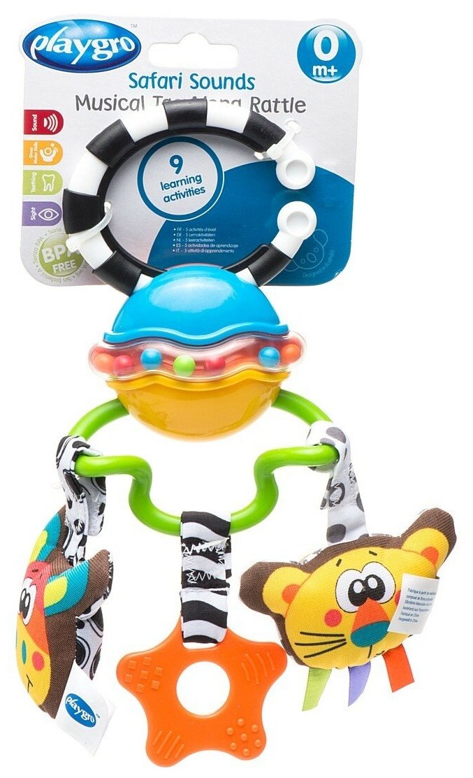 Type: hanging toy, effects: sound, educational elements: rattle, teether, material: plastic, textile