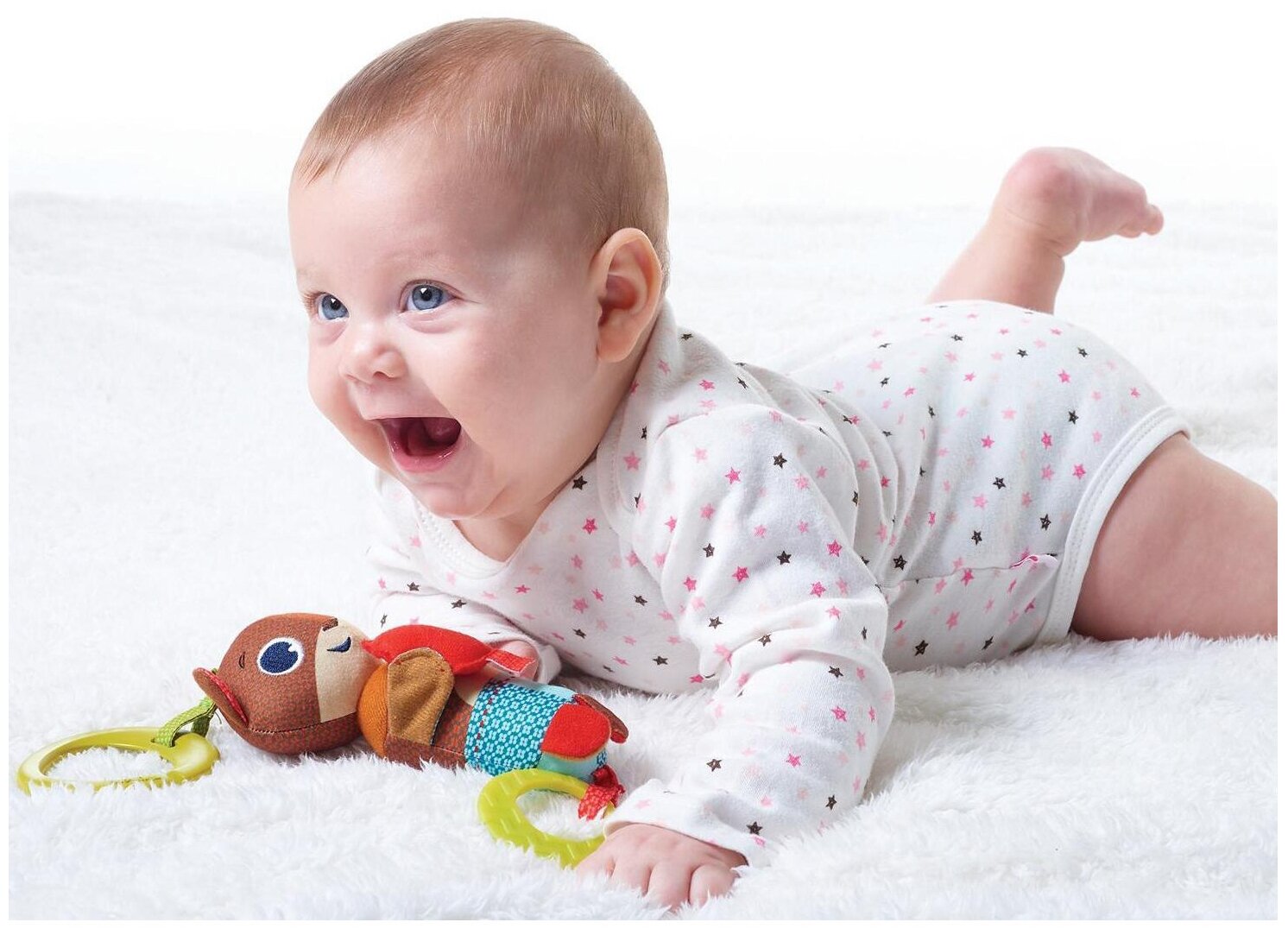 Type: hanging toy, effects: vibration, sound, educational elements: bell, teether, tactile inserts, rustling and crunchy elements, material: plastic, rubber, textile