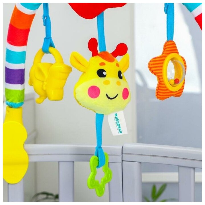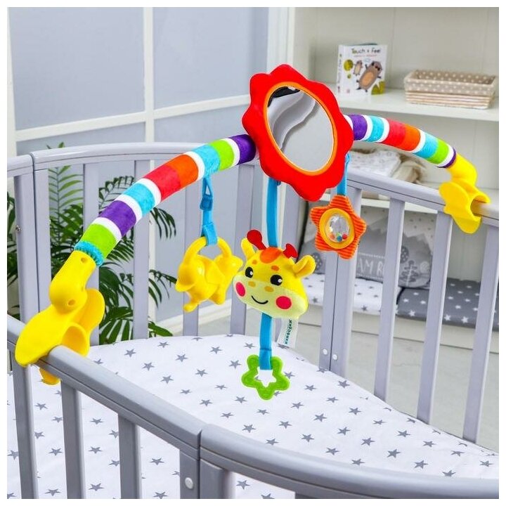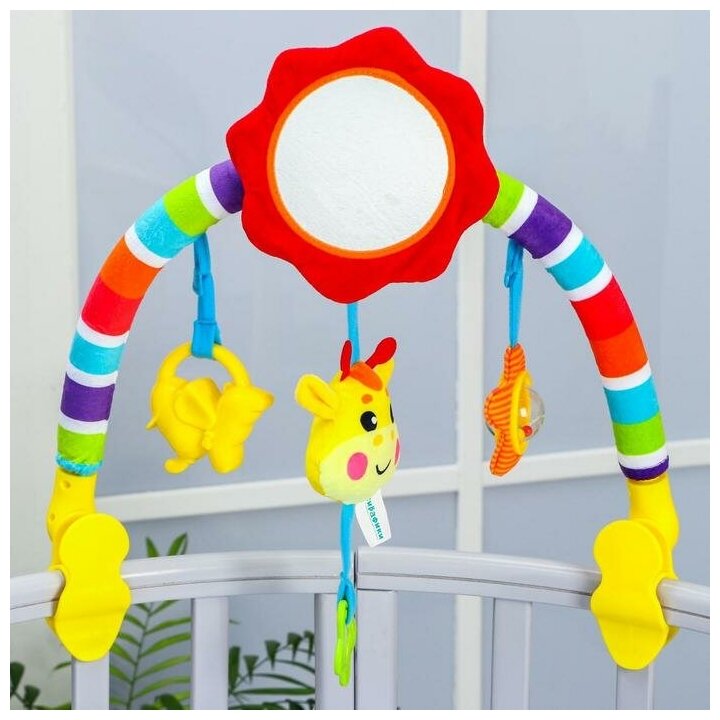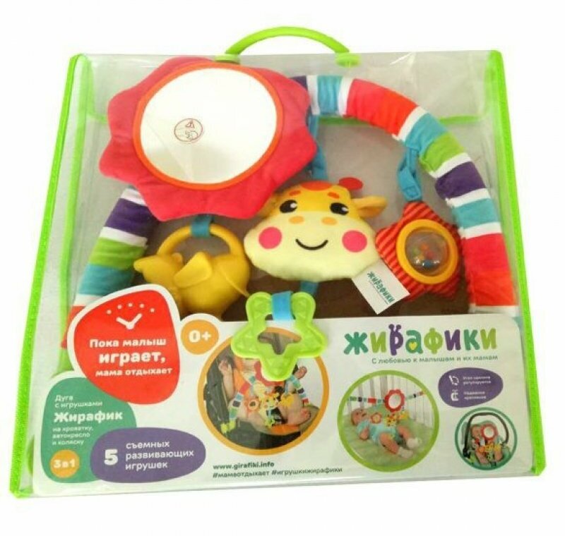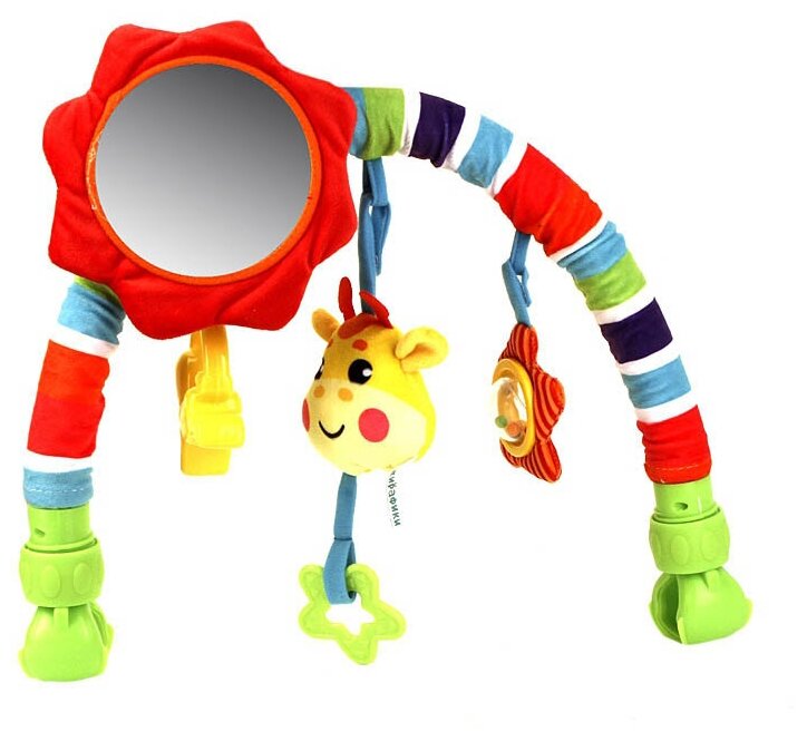Type: arc, effects: sound, educational elements: mirror, squeaker, rattle, teether, material: plastic, textile