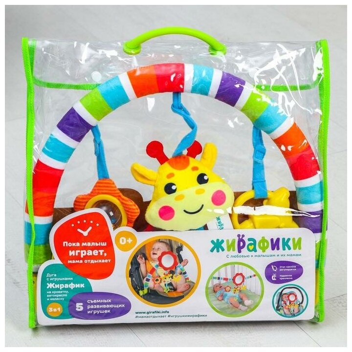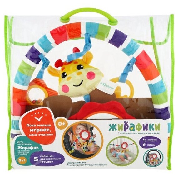 Arc, 5 educational toys: a soft giraffe squeaker, a safety mirror, a teether and 2 funny rattles