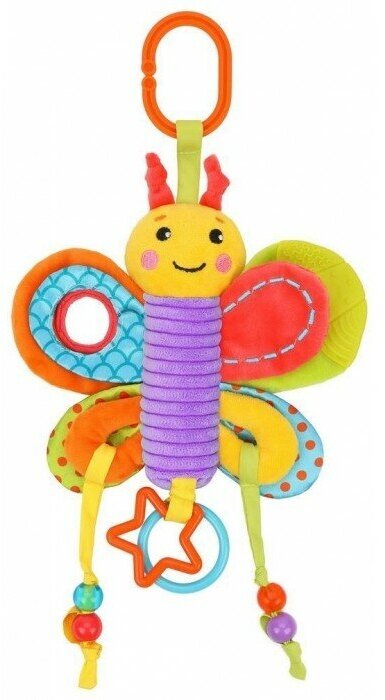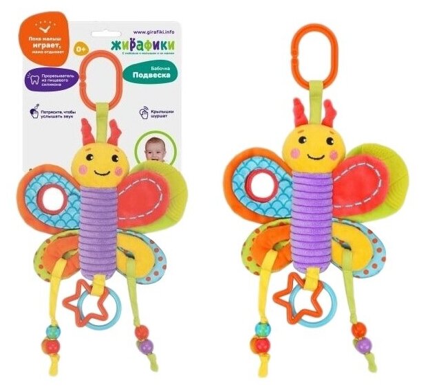 Type: hanging toy, effects: sound, educational elements: mirror, squeaker, rattle, teether, tactile inserts, rustling and crunchy elements, material: plastic, textile