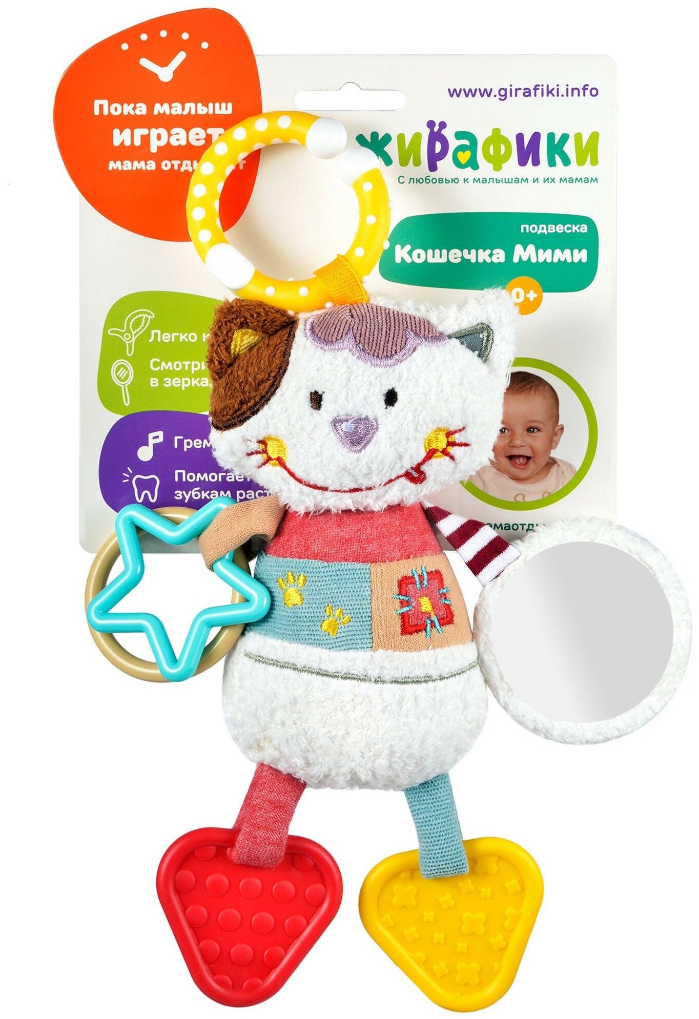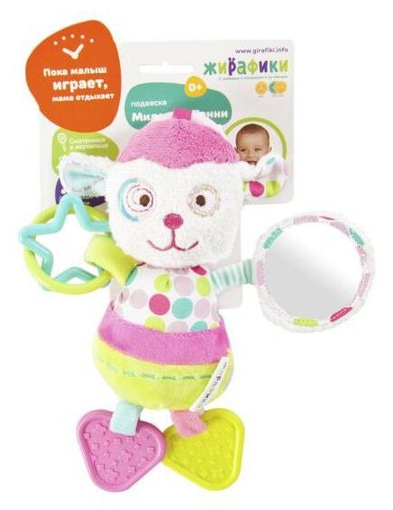 Type: hanging toy, effects: sound, educational elements: mirror, squeaker, rattle, teether, tactile inserts, material: plastic, textile