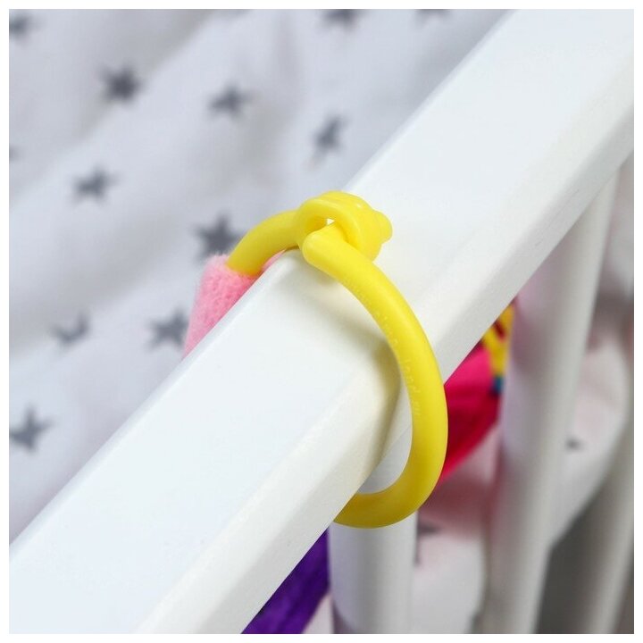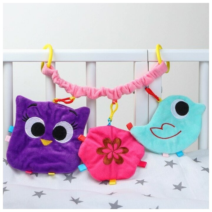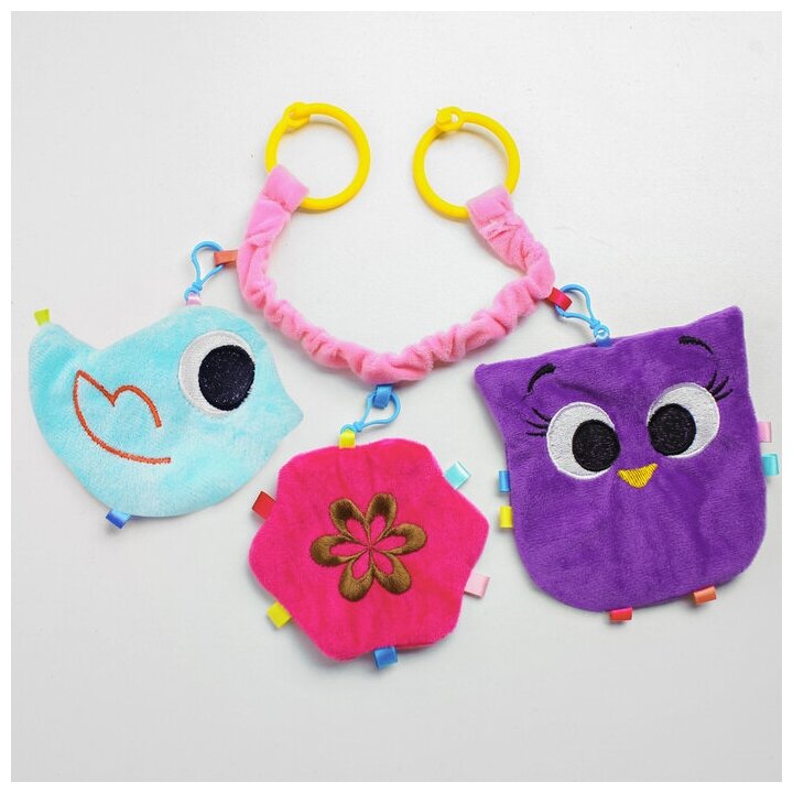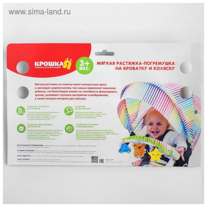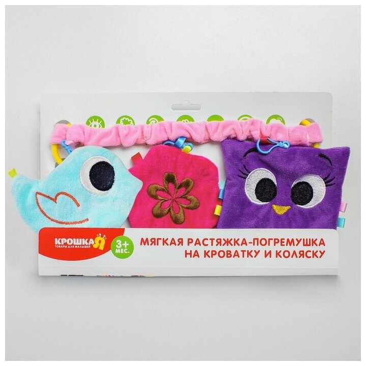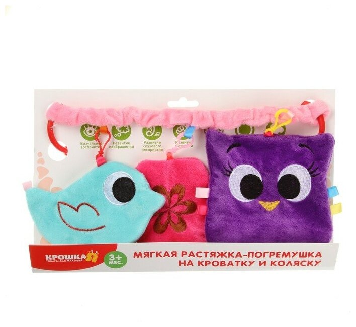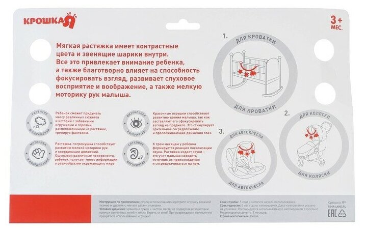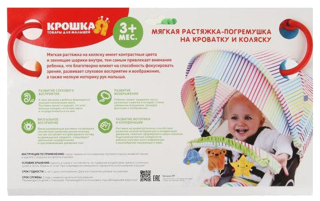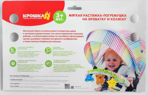 Type: stretching, effects: sound, educational elements: rattle, rustling and crunchy elements, material: plastic, textile