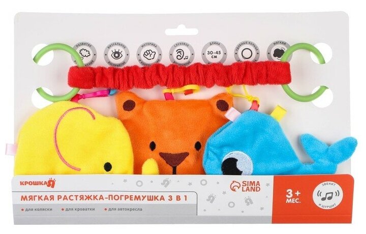 Type: stretching, effects: sound, educational elements: bell, tactile inserts, rustling and crispy elements, material: plastic, textile