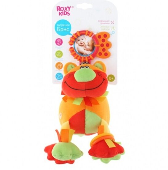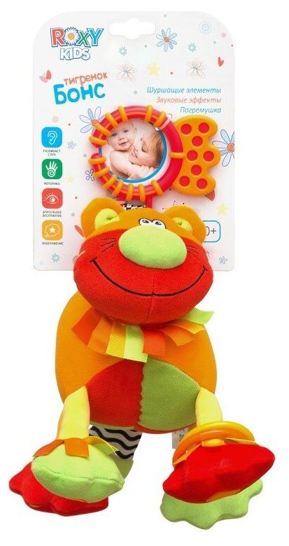 Type: hanging toy, effects: sound, educational elements: squeaker, rattle, rustling and crunchy elements, material: plastic, textile