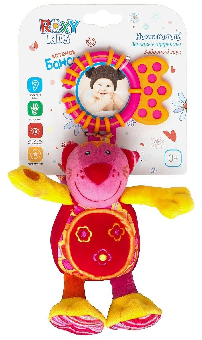 Type: hanging toy, effects: sound, educational elements: squeaker, teether, material: textile