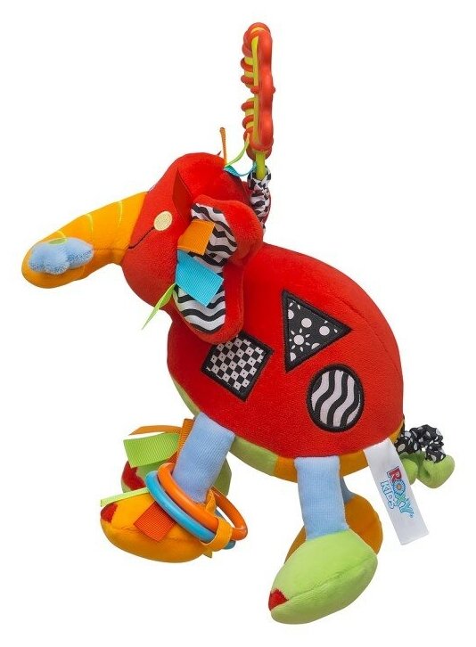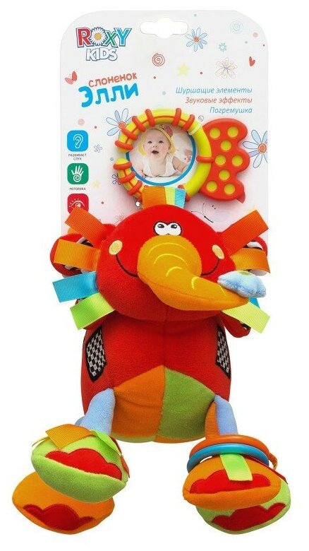 Type: hanging toy, effects: sound, educational elements: squeaker, rattle, tactile inserts, rustling and crunchy elements, material: plastic, textile