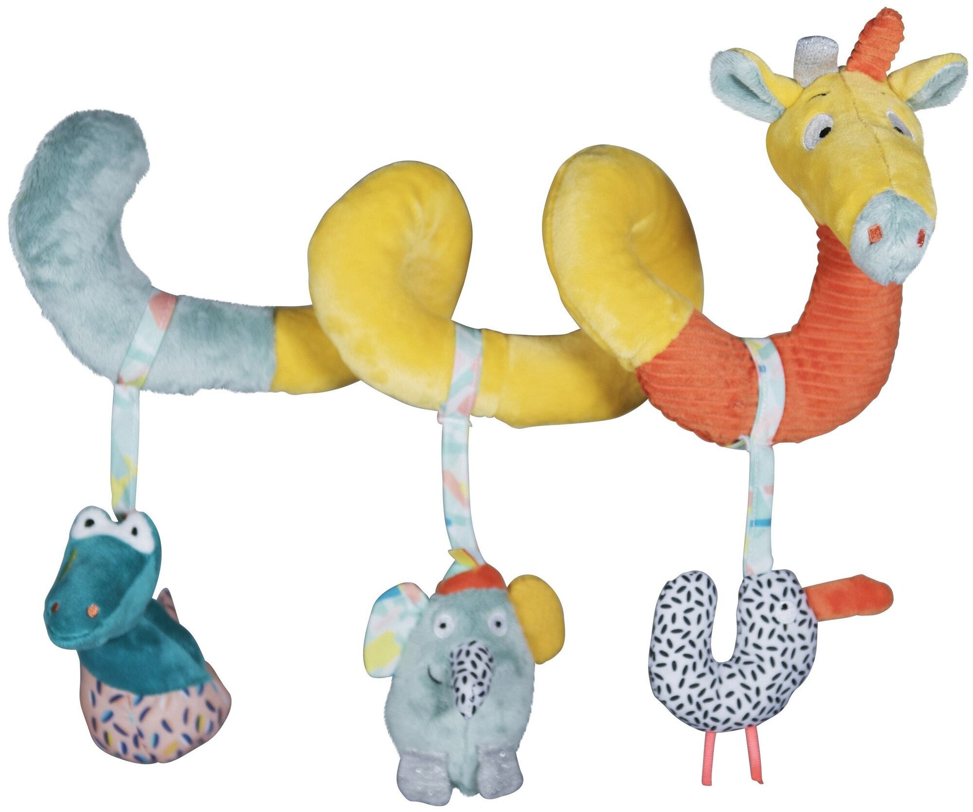 Type: hanging toy, effects: sound, educational elements: bell, squeaker, tactile inserts, rustling and crispy elements, material: textile