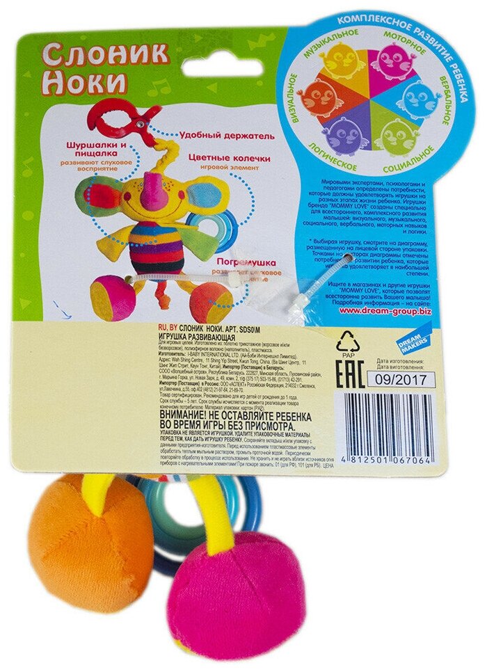 Type: hanging toy, effects: sound, educational elements: rattle, rustling and crunchy elements, material: plastic, textile