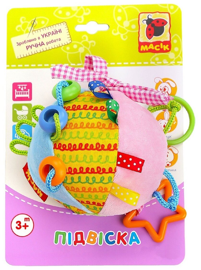 Type: hanging toy, effects: sound, educational elements: squeaker, rattle, tactile inserts, rustling and crunchy elements, material: plastic, textile
