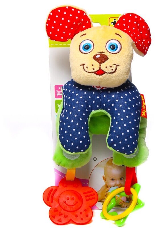 Type: hanging toy, effects: sound, educational elements: teether, tactile inserts, rustling and crunchy elements, material: plastic, textile