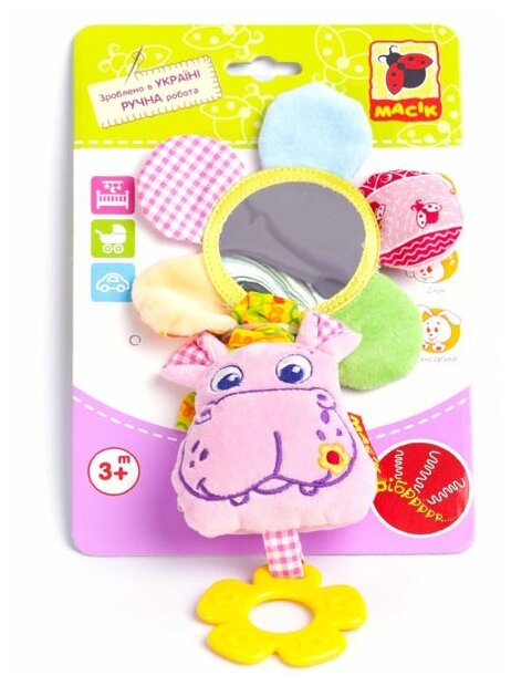 Type: hanging toy, effects: vibration, sound, educational elements: mirror, squeaker, teether, tactile inserts, rustling and crunchy elements, material: plastic, textile