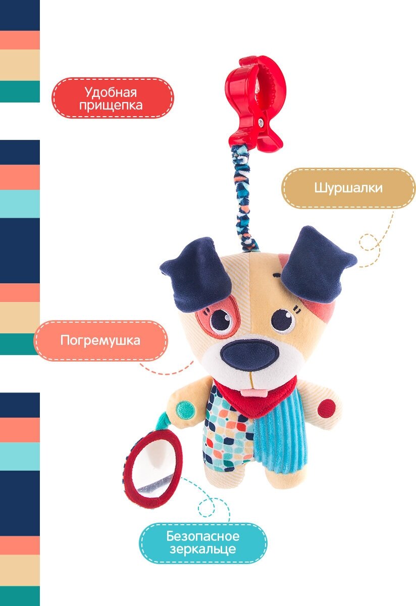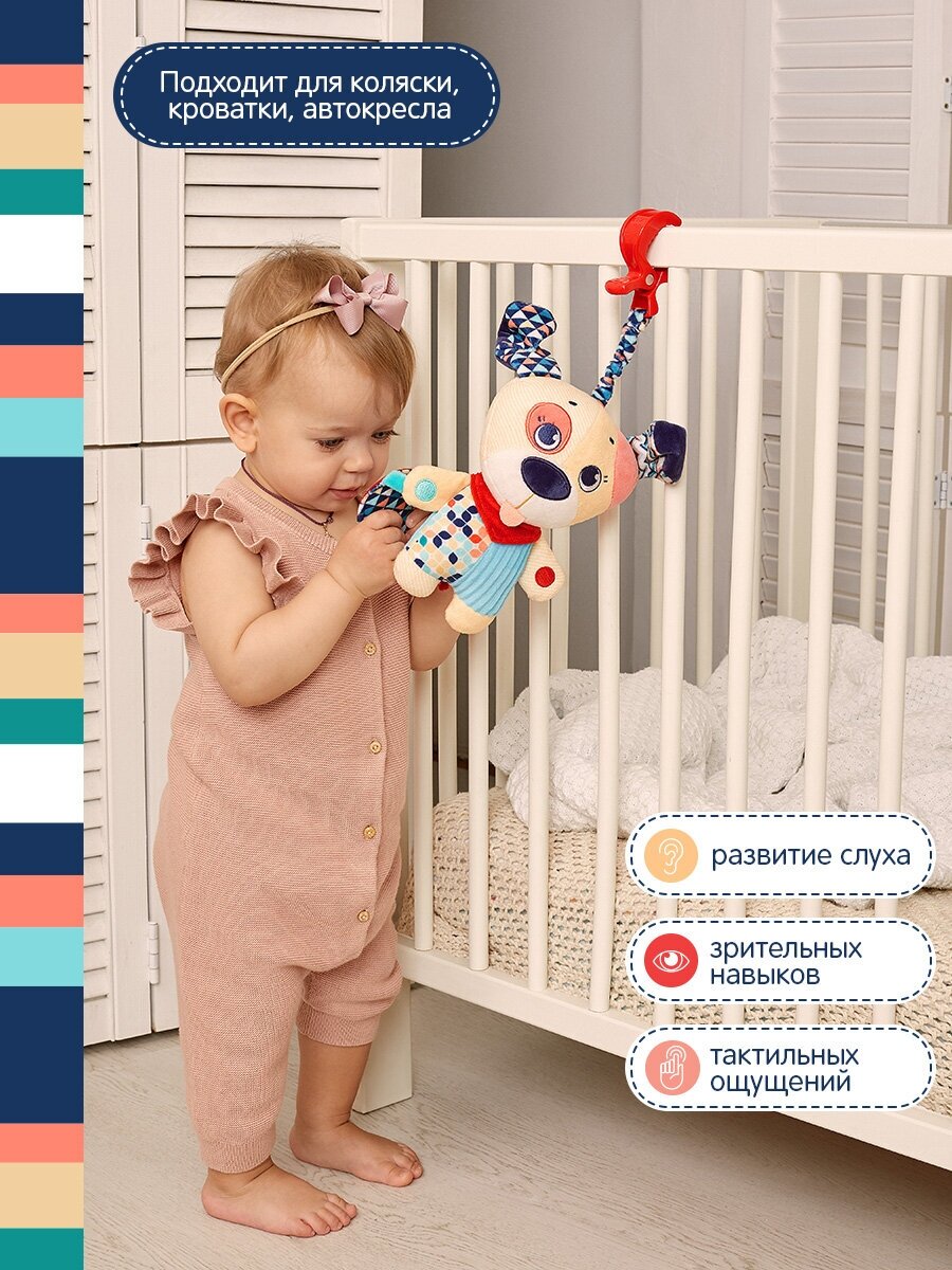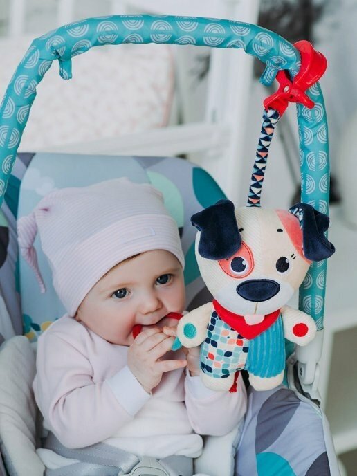 Type: hanging toy, effects: sound, educational elements: mirror, rattle, tactile inserts, rustling and crunchy elements, material: plastic, textile