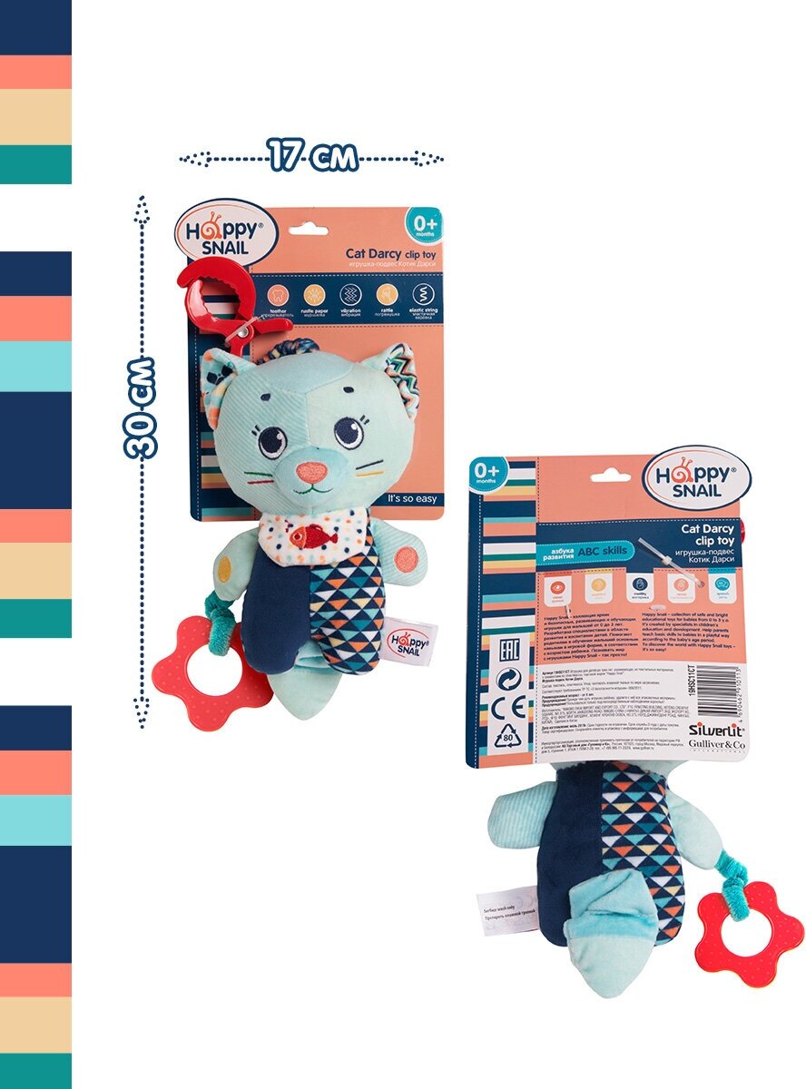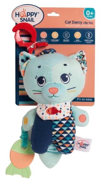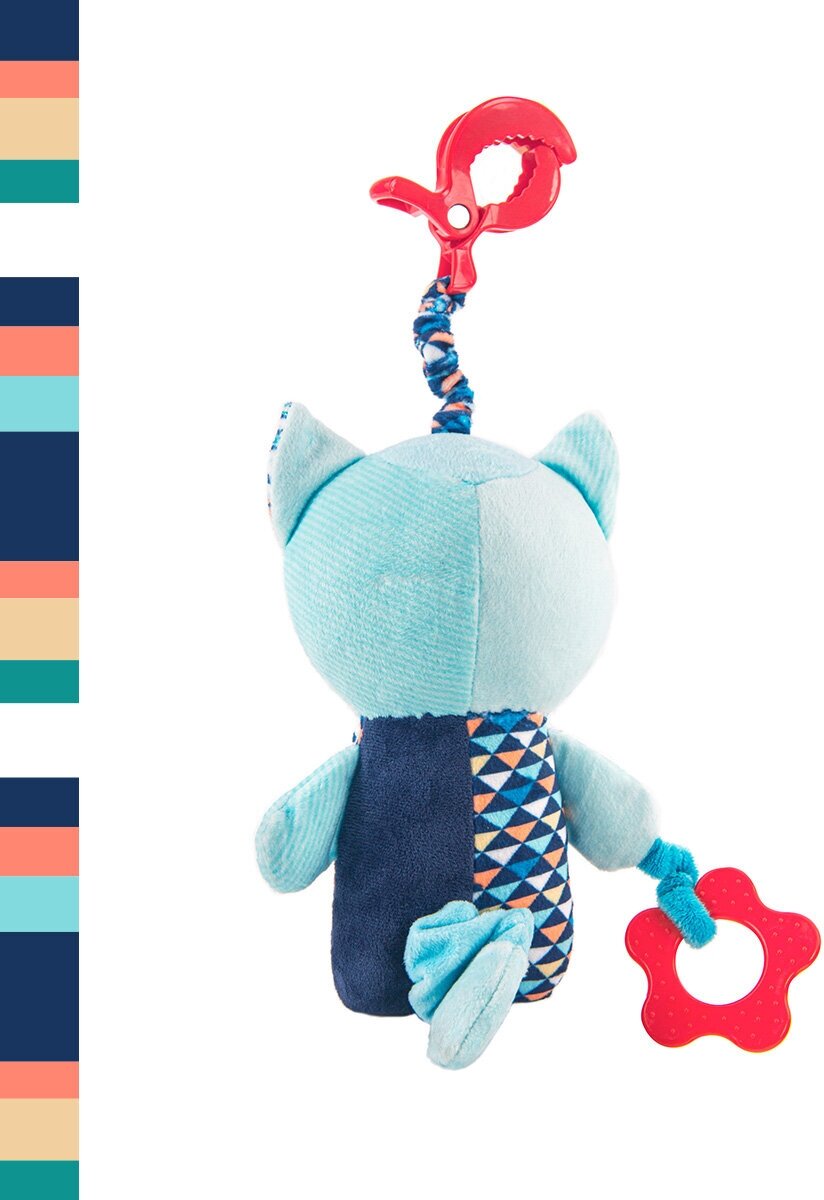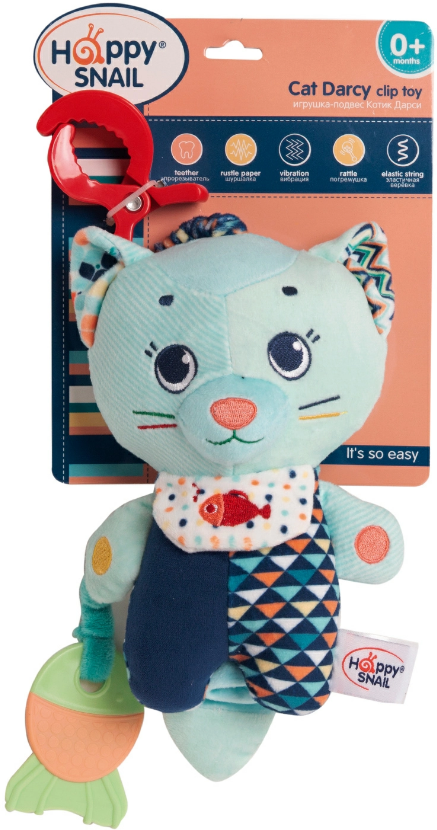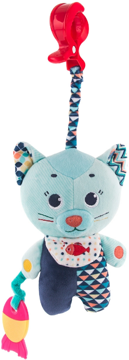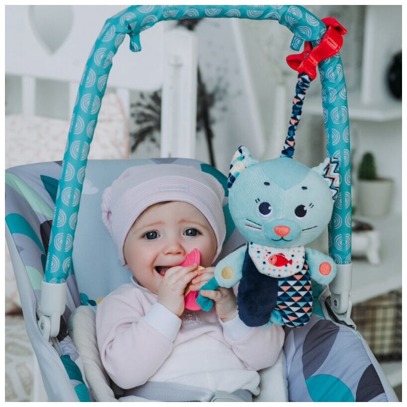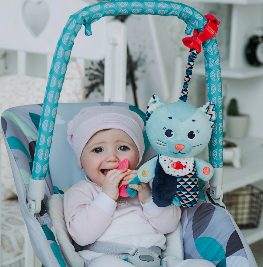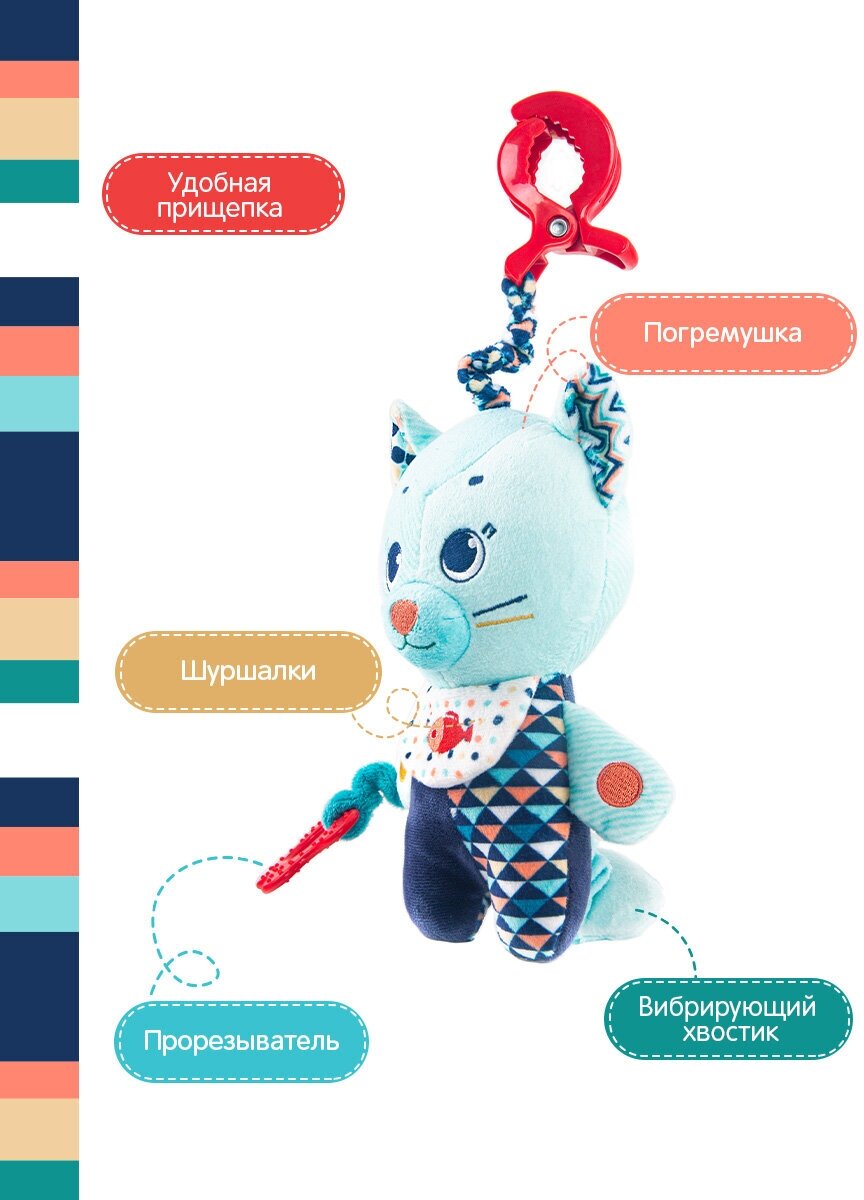 Type: hanging toy, effects: vibration, sound, educational elements: rattle, teether, tactile inserts, rustling and crunchy elements, material: plastic, textile