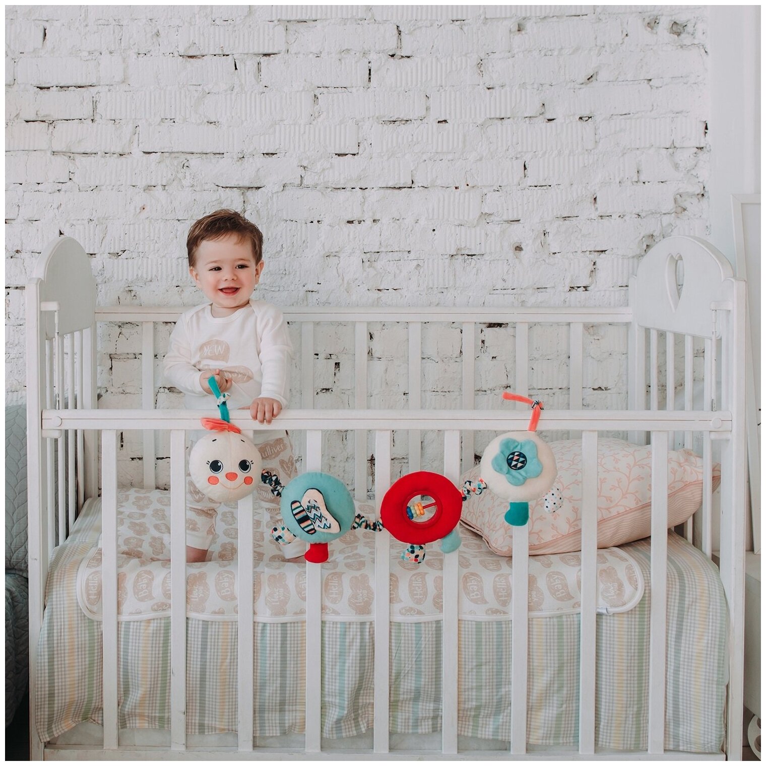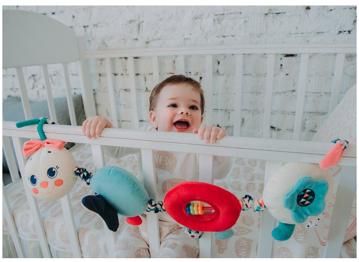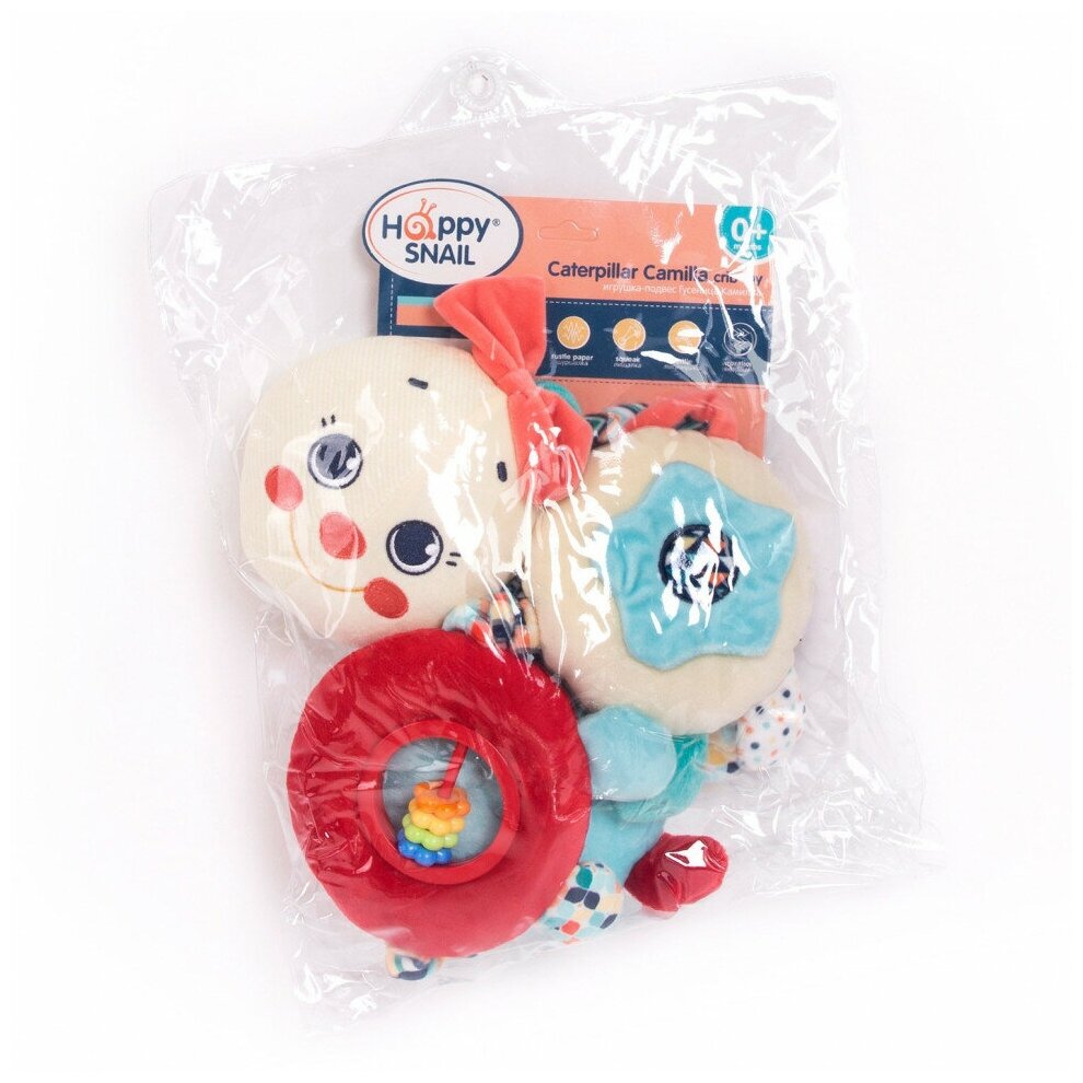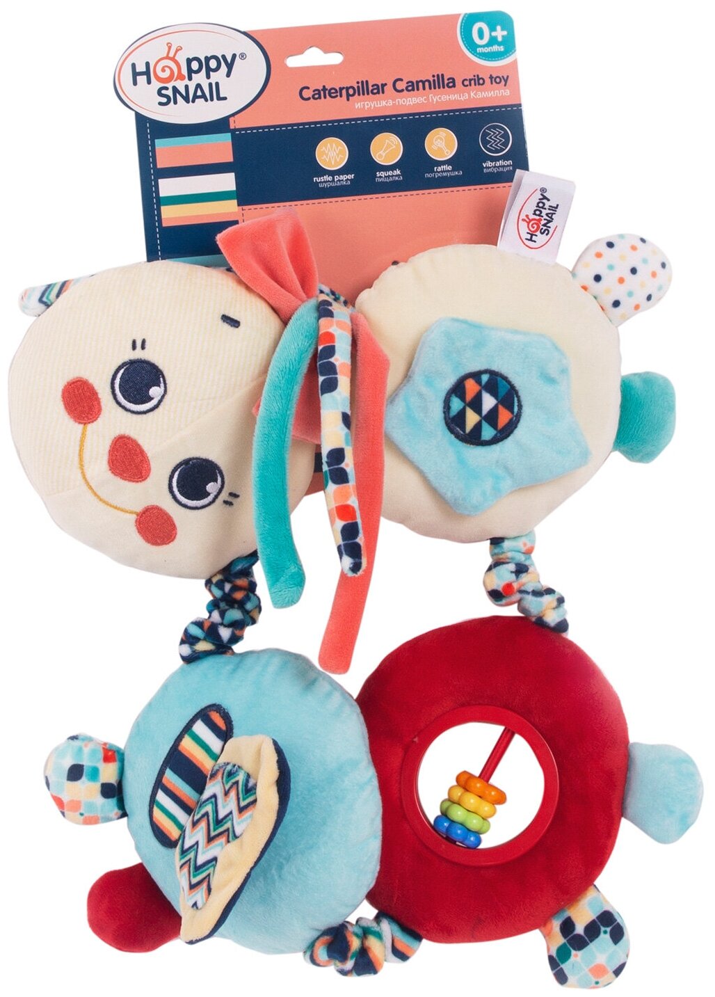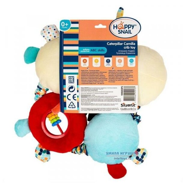 Type: stretching, effects: vibration, sound, developing elements: squeaker, rattle, tactile inserts, rustling and crunchy elements, material: plastic, textile