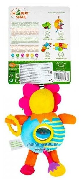 Type: hanging toy, effects: sound, educational elements: rattle, teether, tactile inserts, rustling and crunchy elements, material: plastic, textile