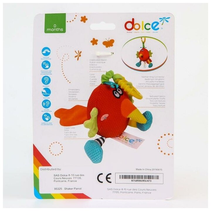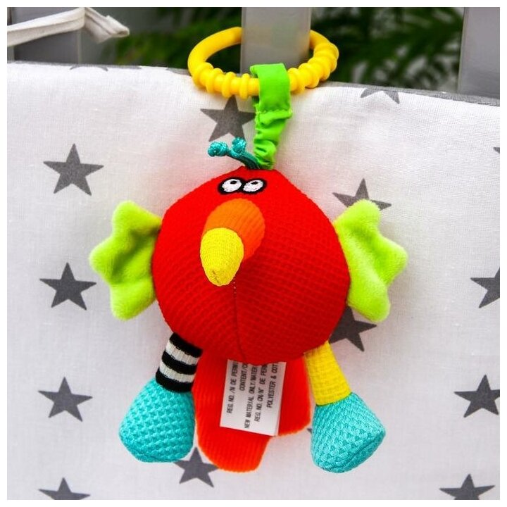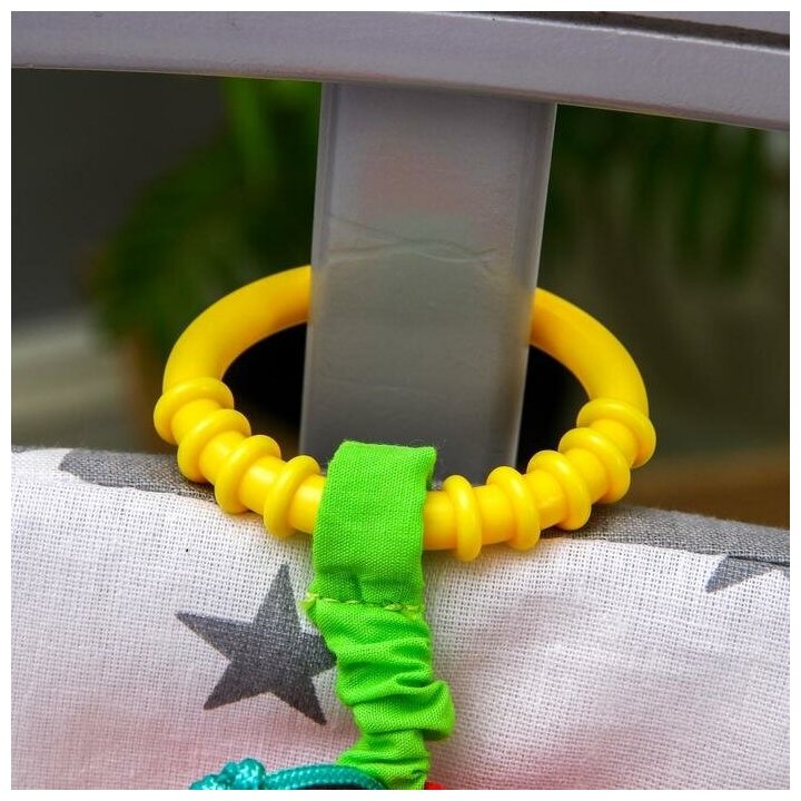 Type: hanging toy, effects: vibration, sound, educational elements: rattle, teether, material: plastic, textile