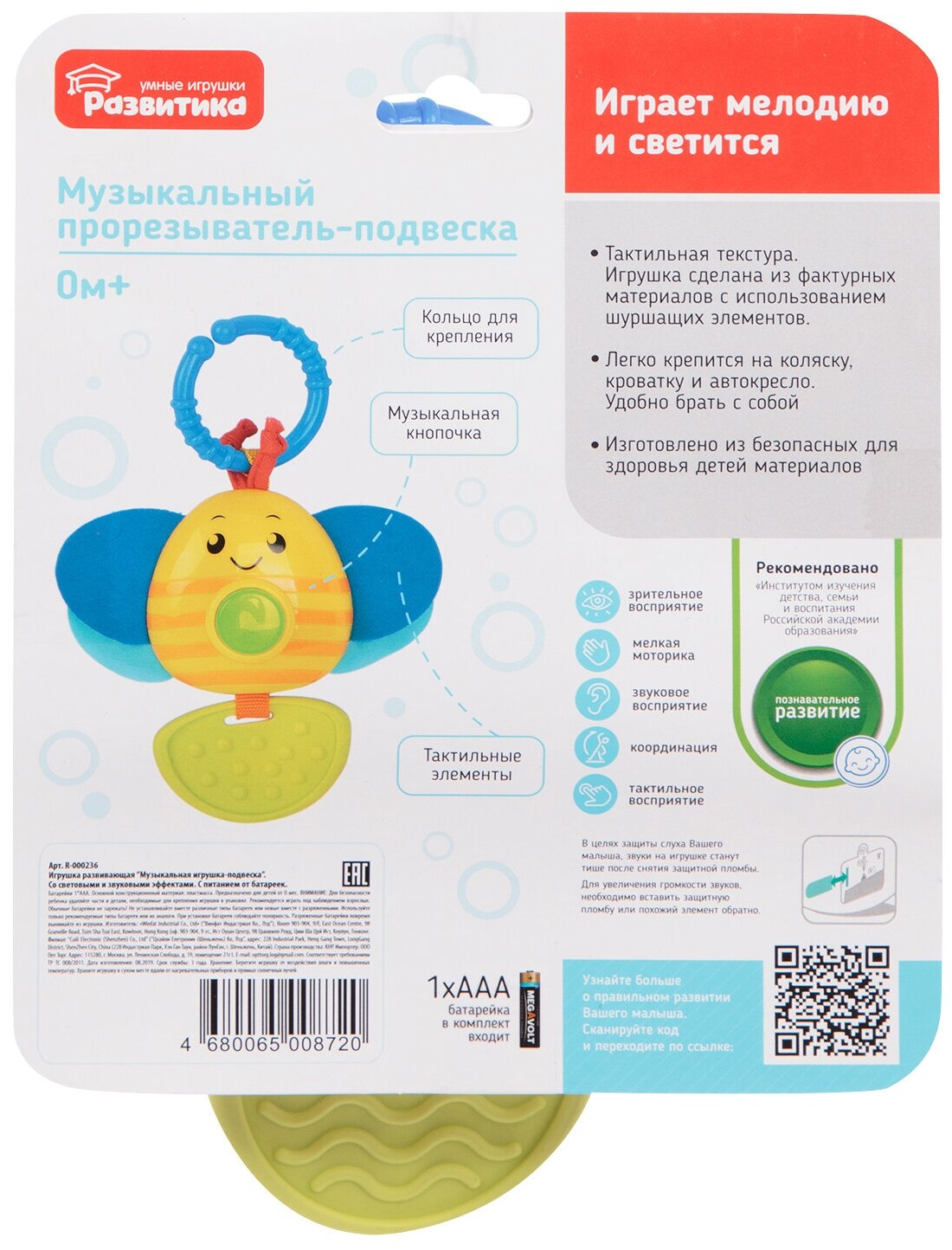 Type: hanging toy, effects: sound, light, educational elements: teether, tactile inserts, rustling and crispy elements, material: plastic, textile