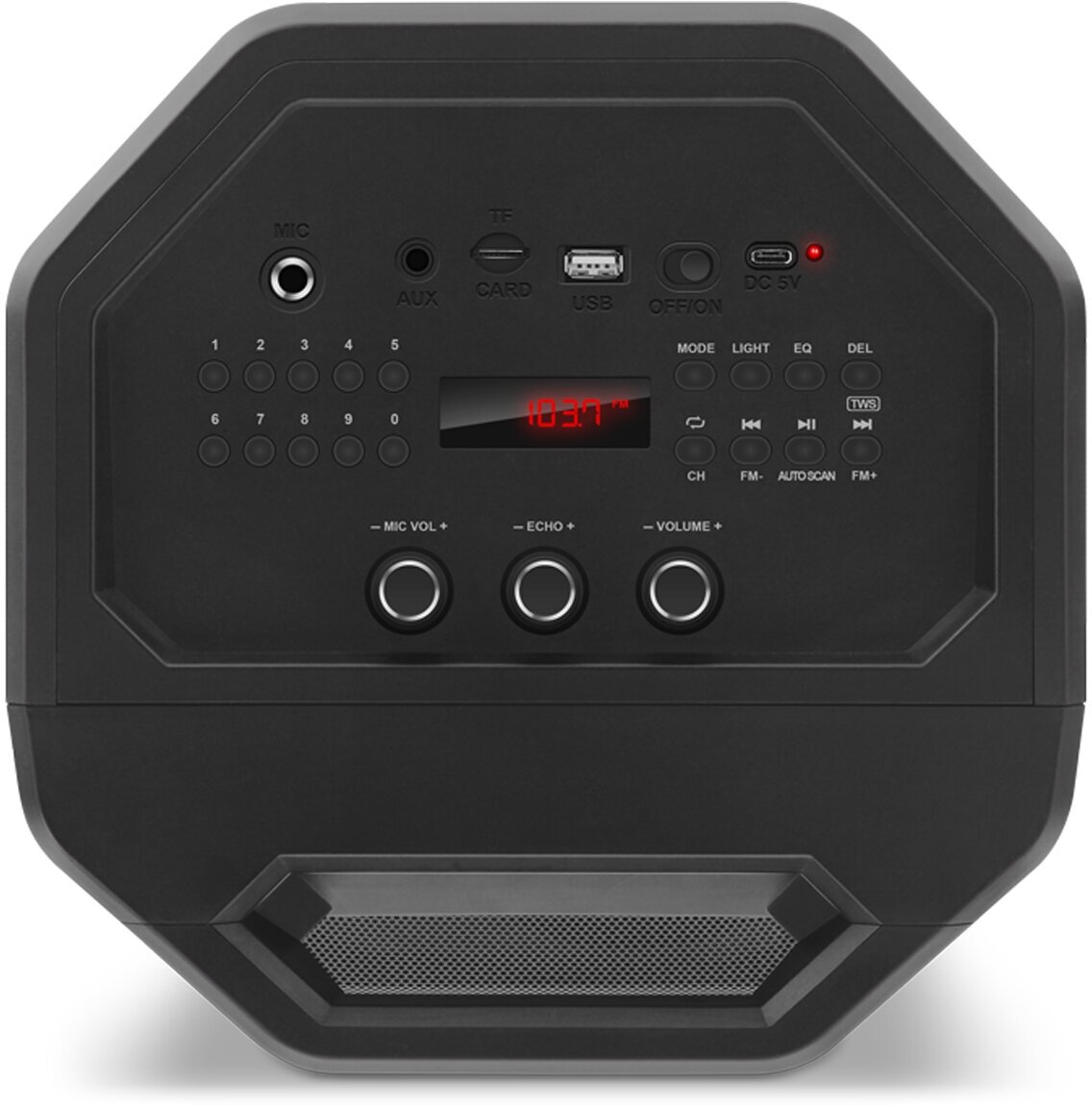 Description: Type: stereo, total power: 65 W, wireless: Bluetooth, connectors and interfaces: USB Type-A for a flash drive, mini jack 3.5 mm audio input, features: FM radio, display, karaoke, microSD support, handle, lighting effects