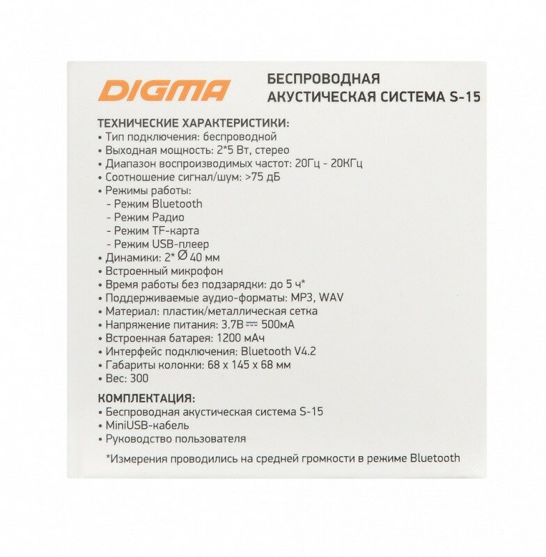 Type: stereo, total power: 10 W, wireless: Bluetooth, connectors and interfaces: USB Type-A for a flash drive, features: FM radio, built-in microphone, HandsFree function, display, microSD support