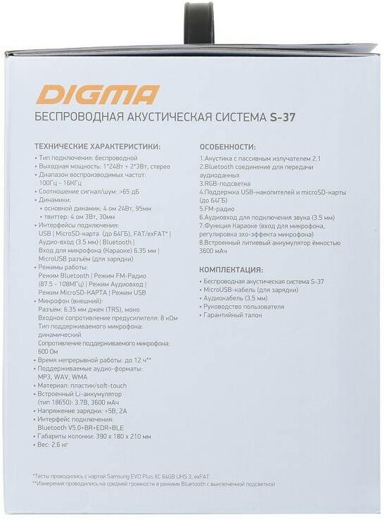 Type: 2.1, total power: 30 W, wireless connection: Bluetooth, connectors and interfaces: USB Type-A for a flash drive, audio input mini jack 3.5 mm, 3.5 mm, USB, microUSB, features: FM radio, display, karaoke, microSD support, lighting effects