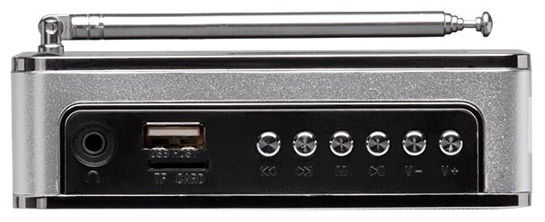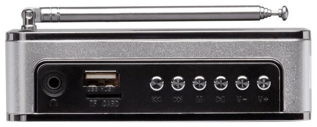 Type: mono, total power: 3 W, connectors and interfaces: USB Type-A for a flash drive, audio input mini jack 3.5 mm, features: FM radio, alarm clock, built-in clock, microSD support