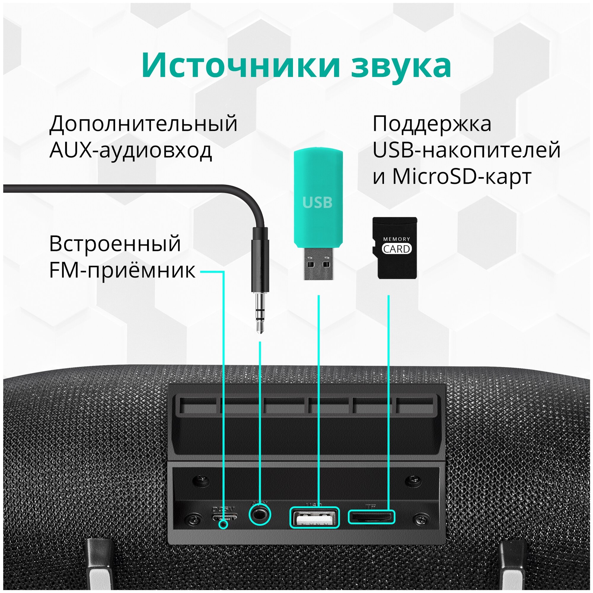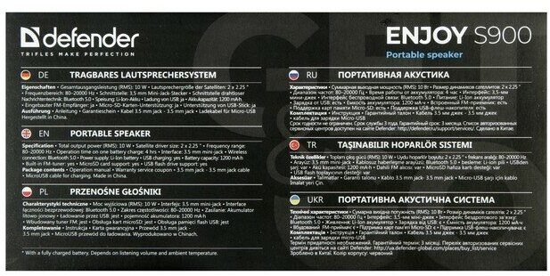 Type: stereo, total power: 10 W, wireless: Bluetooth, connectors and interfaces: USB Type-A for a flash drive, audio input mini jack 3.5 mm, 3.5 mm, USB, microUSB, features: FM radio, built-in microphone HandsFree function , microSD support, strap