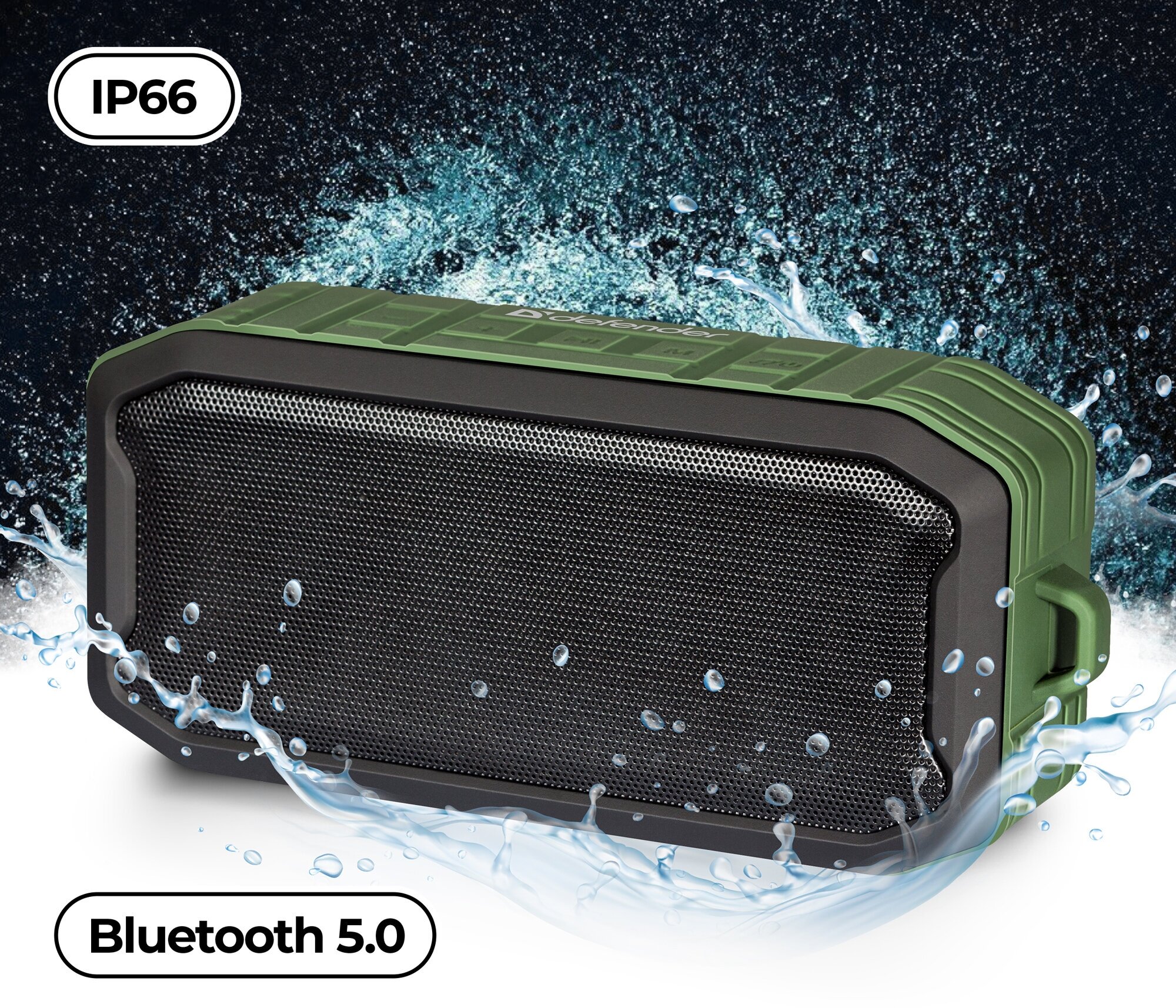 FM radio, waterproof case, built-in microphone, HandsFree function, carabiner, microSD support, passive mode operation, lighting effects