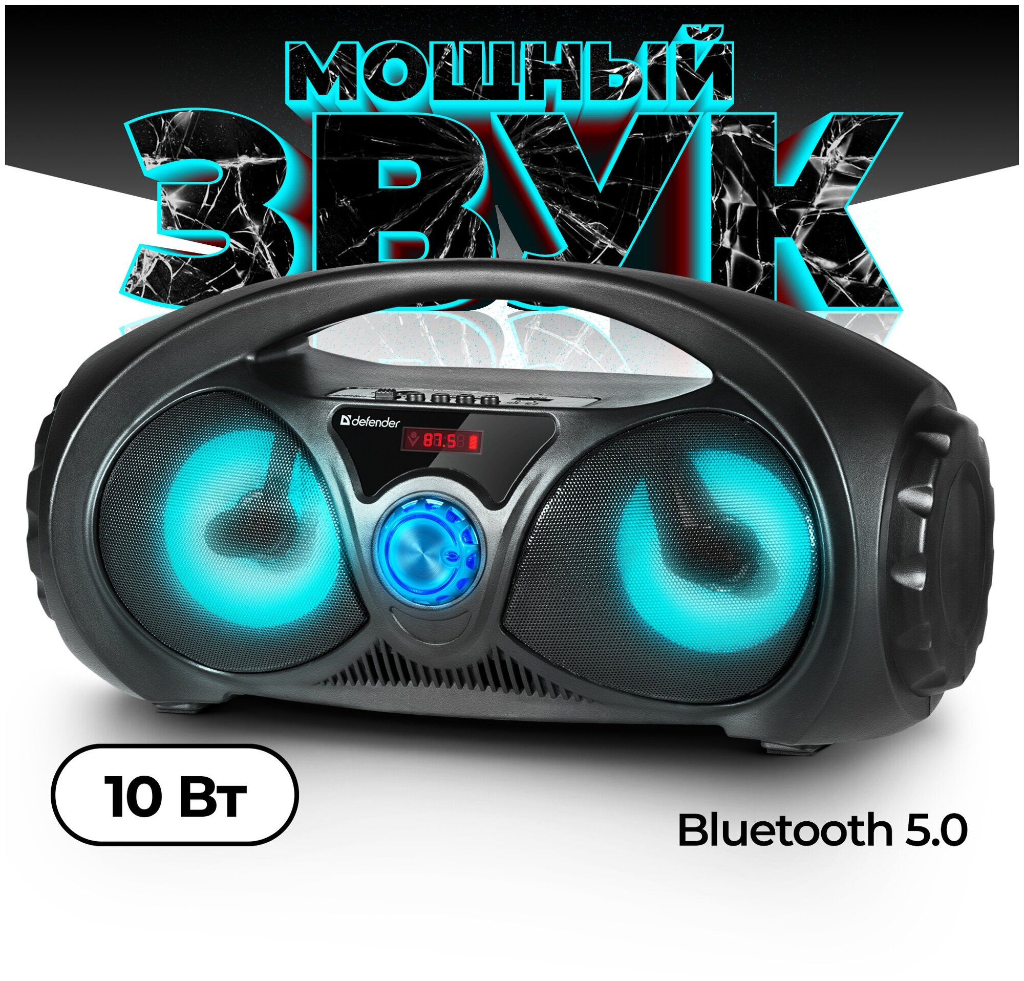 Description: Type: stereo, total power: 10 W, wireless: Bluetooth, connectors and interfaces: USB Type-A for a flash drive, mini jack 3.5 mm audio input, features: FM radio, display, microSD support, handle, lighting effects