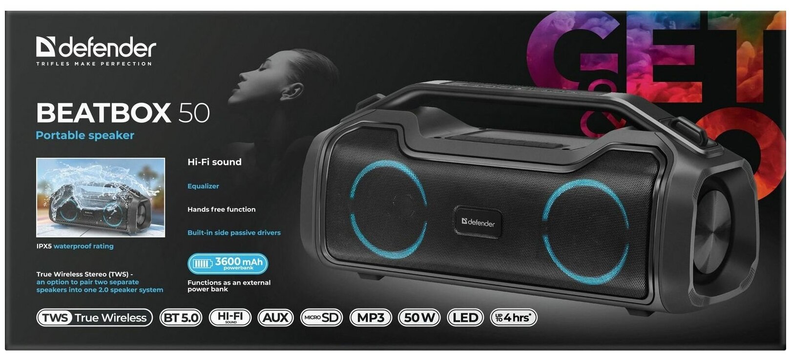 Type: stereo, total power: 50 W, wireless: Bluetooth, Wireless interface - Bluetooth 5.0, connectors and interfaces: audio input, features: FM radio, microSD support