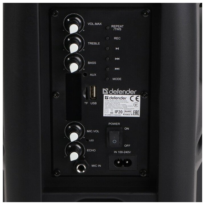 Type: mono, total power: 30 W, wireless: Bluetooth, Wireless interface - Bluetooth 5.0, connectors and interfaces: Microphone connector. Karaoke mode - microphone input with volume control and echo effect.,