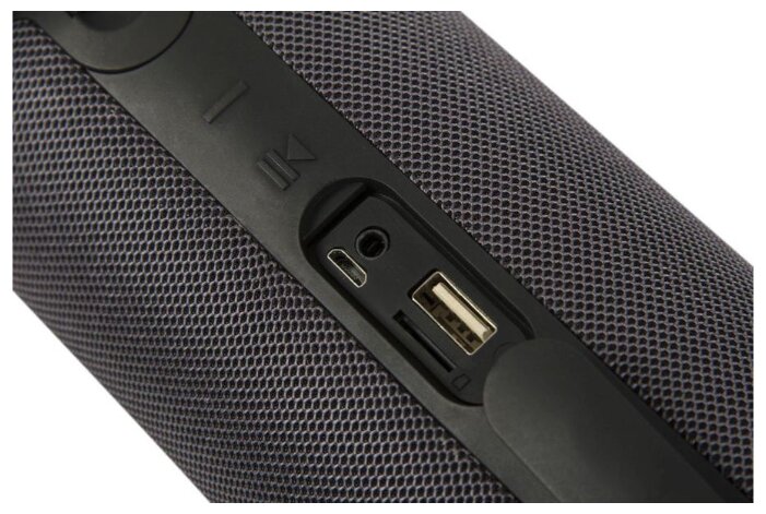 Type: stereo, total power: 10 W, wireless: Bluetooth, connectors and interfaces: USB Type-A for a flash drive, audio mini jack 3.5 mm, features: FM radio, waterproof case, built-in microphone HandsFree function, mic support