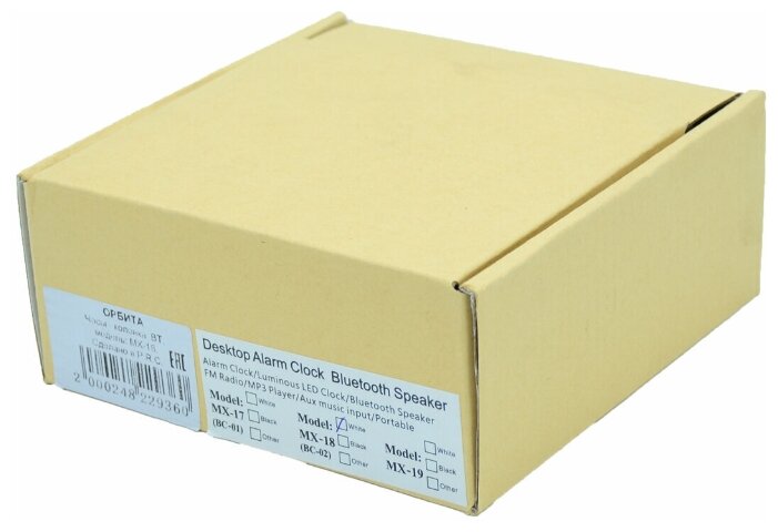 Type: stereo, total power: 3 W, wireless: Bluetooth, features: FM radio, alarm clock, built-in clock, built-in microphone, HandsFree function, display, microSD support, passive mode operation
