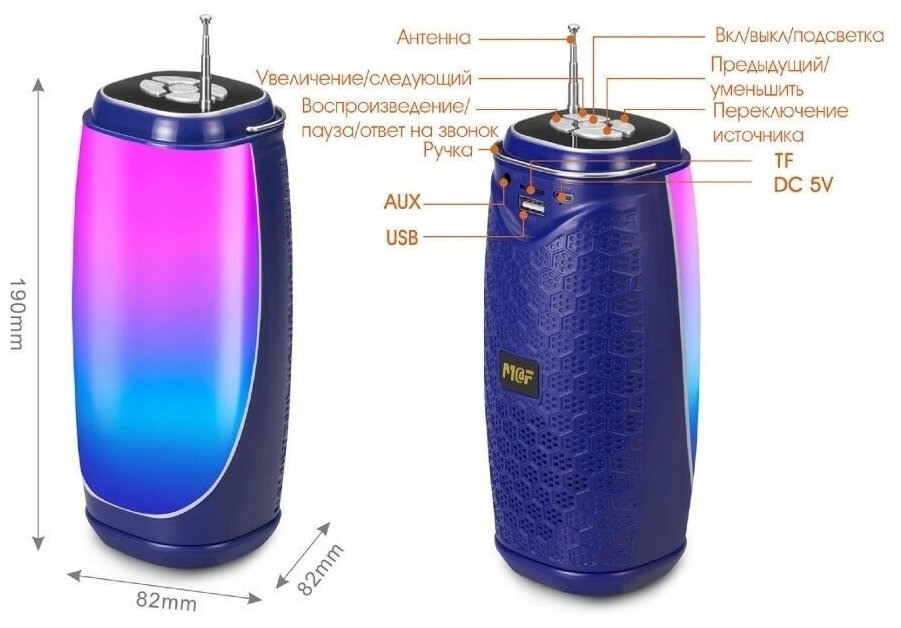 FM radio, built-in handsfree microphone, microSD support, lighting effects