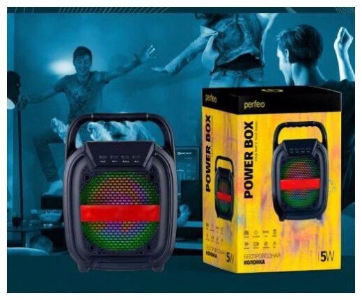 Portable speaker Perfeo Power Box 5, Bluetooth, TWS function, FM/USB/AUX/MP3, RGB, 5W