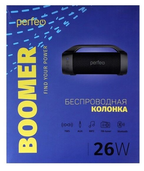 Portable speaker Perfeo BOOMER, FM, MP3, microSD, USB, AUX, 26 W, 3600 mAh, black
