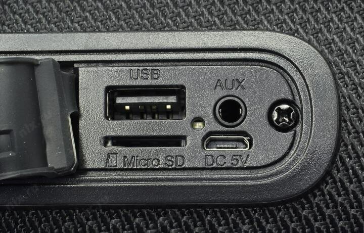 Type: stereo, total power: 10 W, wireless: Bluetooth, connectors and interfaces: USB Type-A for a flash drive, audio mini jack 3.5 mm, features: FM radio, waterproof case, microSD support, lighting effects