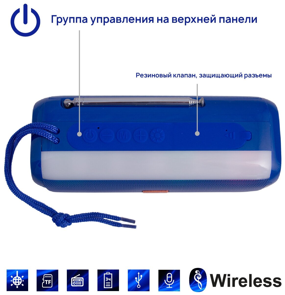 Type: stereo, total power: 10 W, wireless: Bluetooth, connectors and interfaces: USB for connecting to a computer, USB Type-A for a flash drive, audio input mini jack 3.5 mm, features: FM radio, waterproof housing, built-in microphone