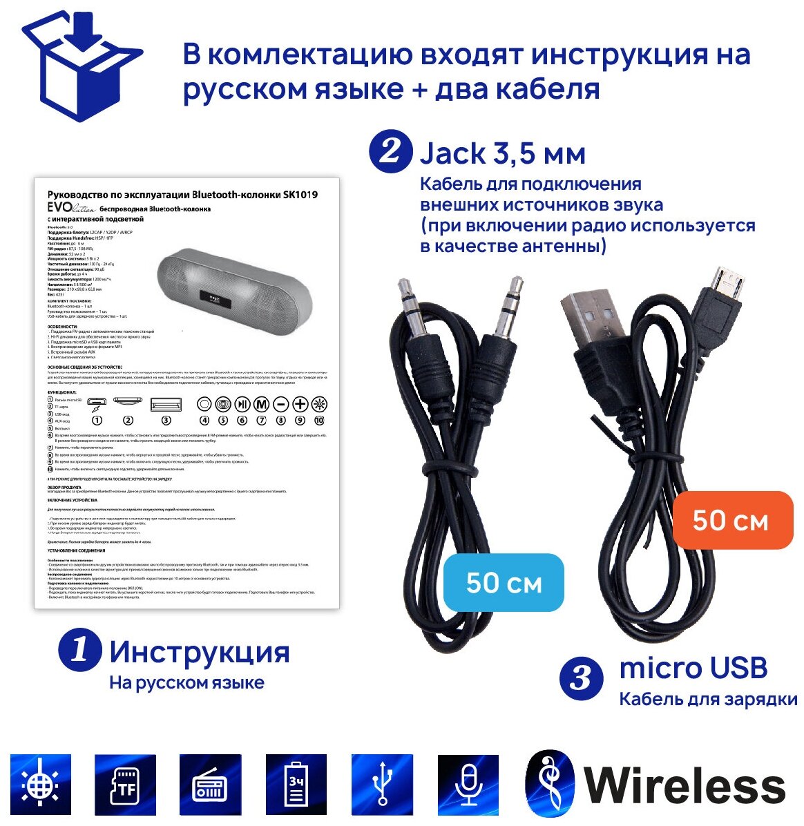 FM radio, microSD support, strap, lighting effects