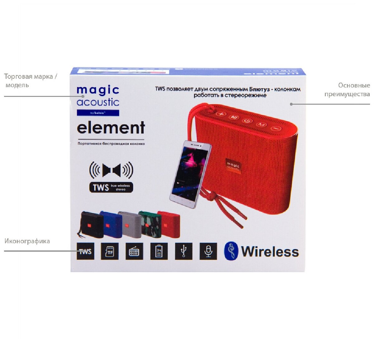 Type: stereo, total power: 10 W, wireless: Bluetooth, connectors and interfaces: USB for connecting to a computer, USB Type-A for a flash drive, audio input mini jack 3.5 mm, features: FM radio