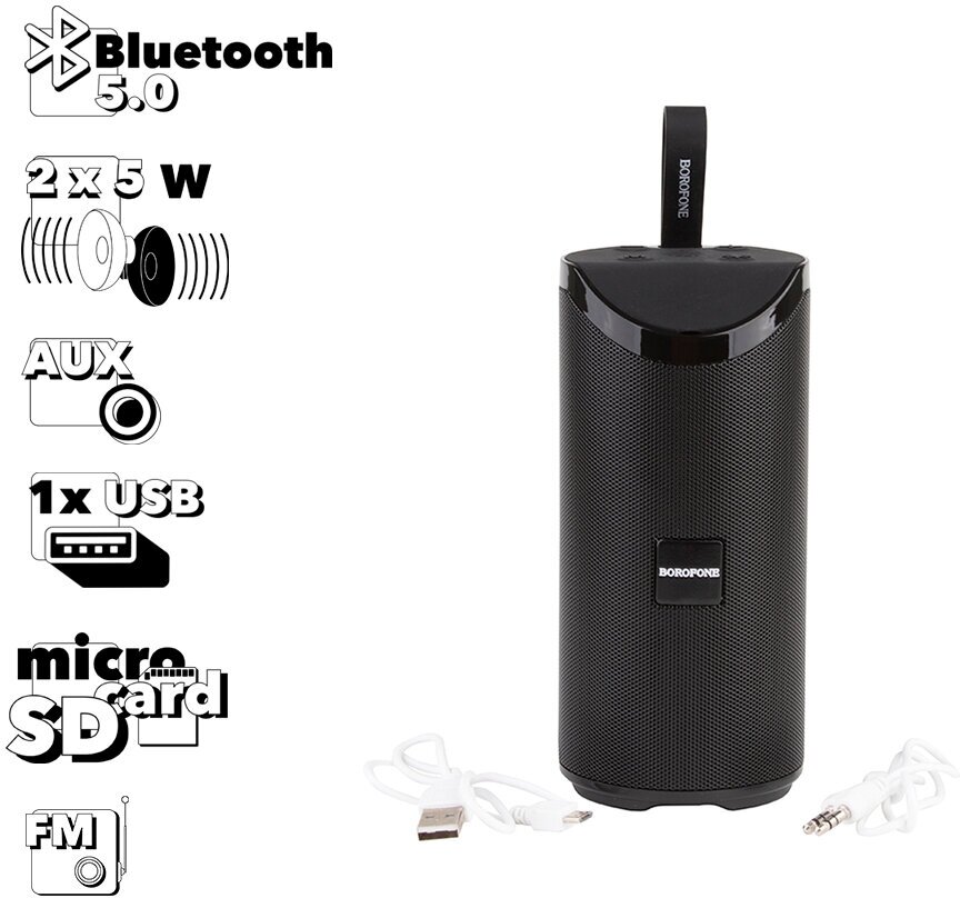 Type: stereo, total power: 10 W, wireless connection: Bluetooth, connectors and interfaces: USB Type-A for a flash drive, audio input mini jack 3.5 mm, 3.5 mm, features: FM radio, built-in microphone HandsFree function, microSD support, light effect