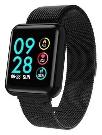 Smart watch P68 with a color screen and a black Milanese loop metal bracelet. Characteristics: case dimensions 34x39.9x10.2 mm; Bracelet: removable metal; Processor: NRF52832 OFAA; Display: 1.3 inch IPS extended