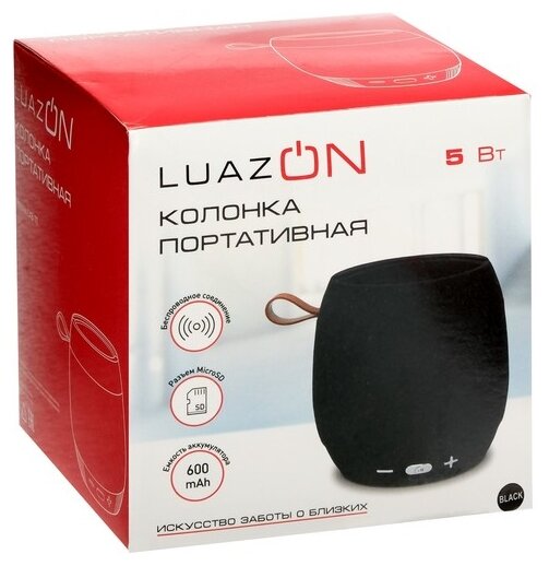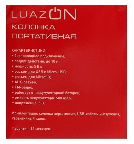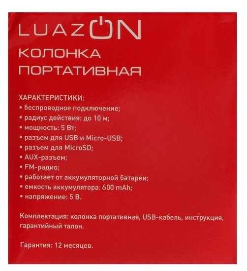 Type: mono, total power: 5 W, wireless: Bluetooth, connectors and interfaces: USB Type-A for a flash drive, audio input mini jack 3.5 mm, features: FM radio, microSD support, strap, handle, lighting effects