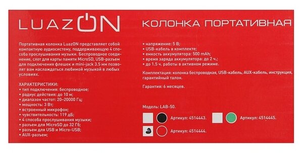 Type: mono, total power: 3 W, wireless: Bluetooth, connectors and interfaces: USB Type-A for a flash drive, audio input mini jack 3.5 mm, features: built-in microphone, HandsFree function, microSD support, strap