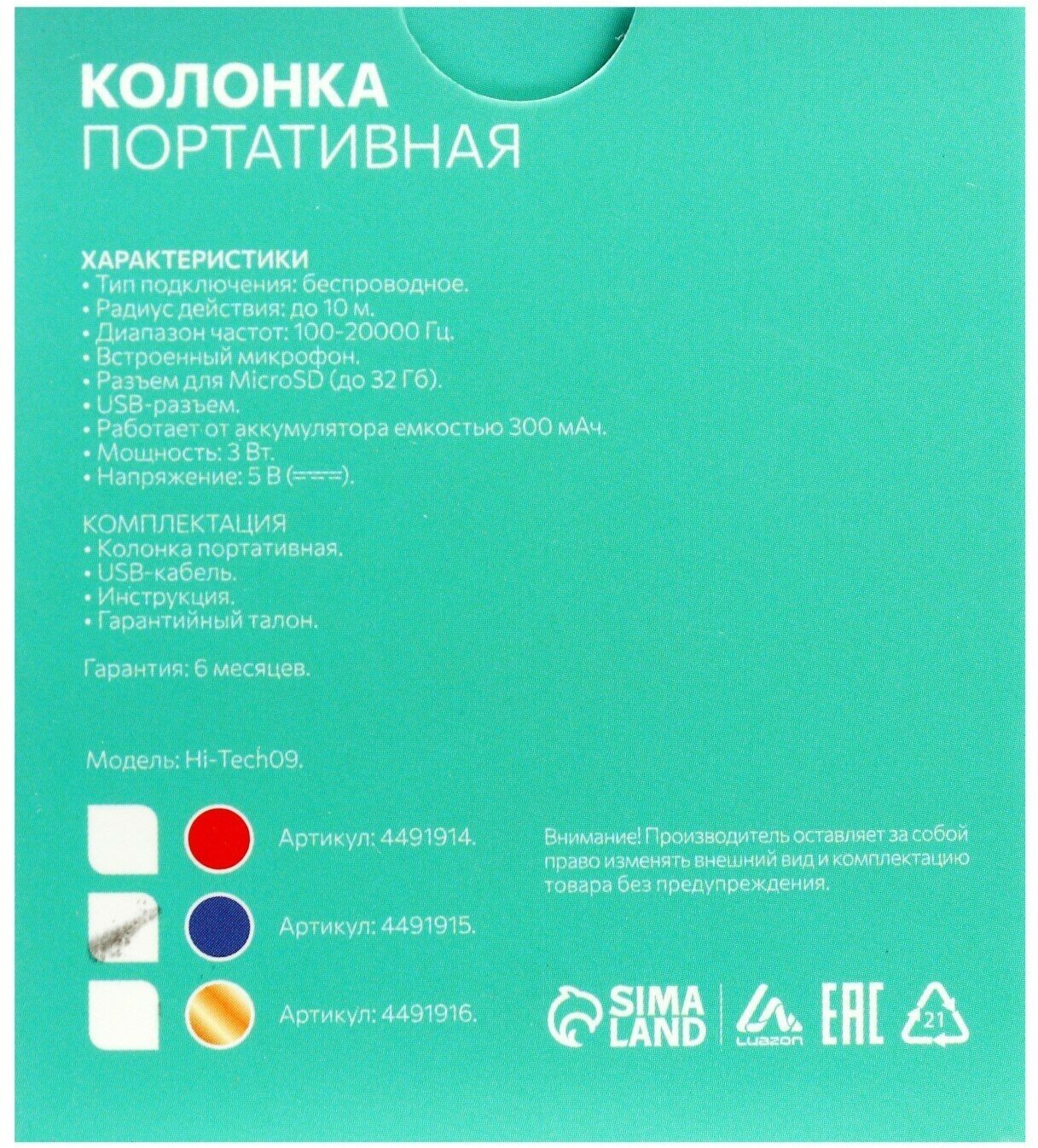 Type: mono, total power: 3 W, wireless: Bluetooth, features: built-in microphone, HandsFree function, microSD support